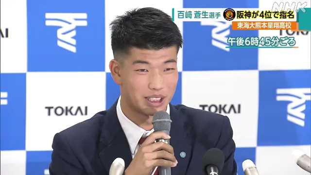 @reo_naniwa#阪神 #ドラフト 4位指名 #百崎蒼生 内野手(#東海大熊本星翔) #熊本市 内で指名挨拶 #百崎「嬉しいが一番 これからしっかり遊撃一本でやっていきたい」 38年ぶり #日本一 #日本シリーズ もTV観戦し大きな刺激に 「今の評価以上のプレーをスタートから見せられる様 自主トレまでしっかり過ごしたい」 pic.twitter.com/PH9UHmTTw4
