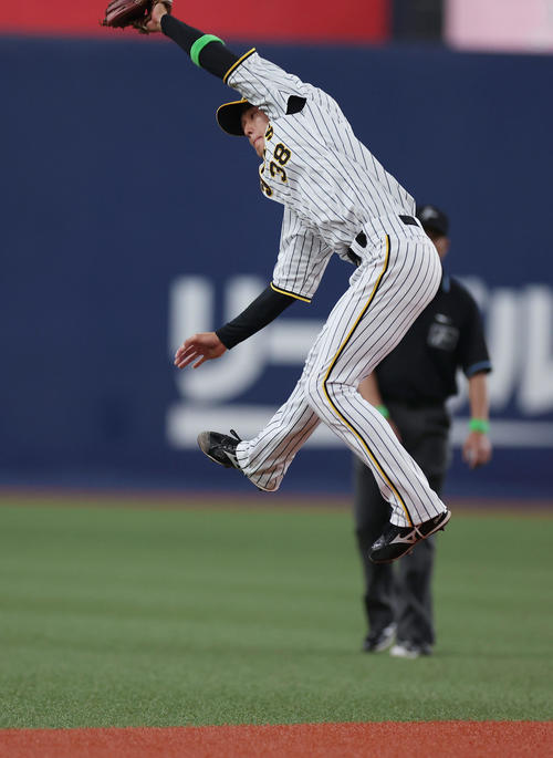 @yamashi_aki阪神・小幡竜平内野手(23)が美技を披露した。2-2の同点で迎えた六回の守備。先頭・長岡が放った二遊間への痛烈な打球に飛びつき捕球すると、素早く立ち上がって一塁へ転送。接戦の中で重要な先頭打者の出塁を防いだ。
